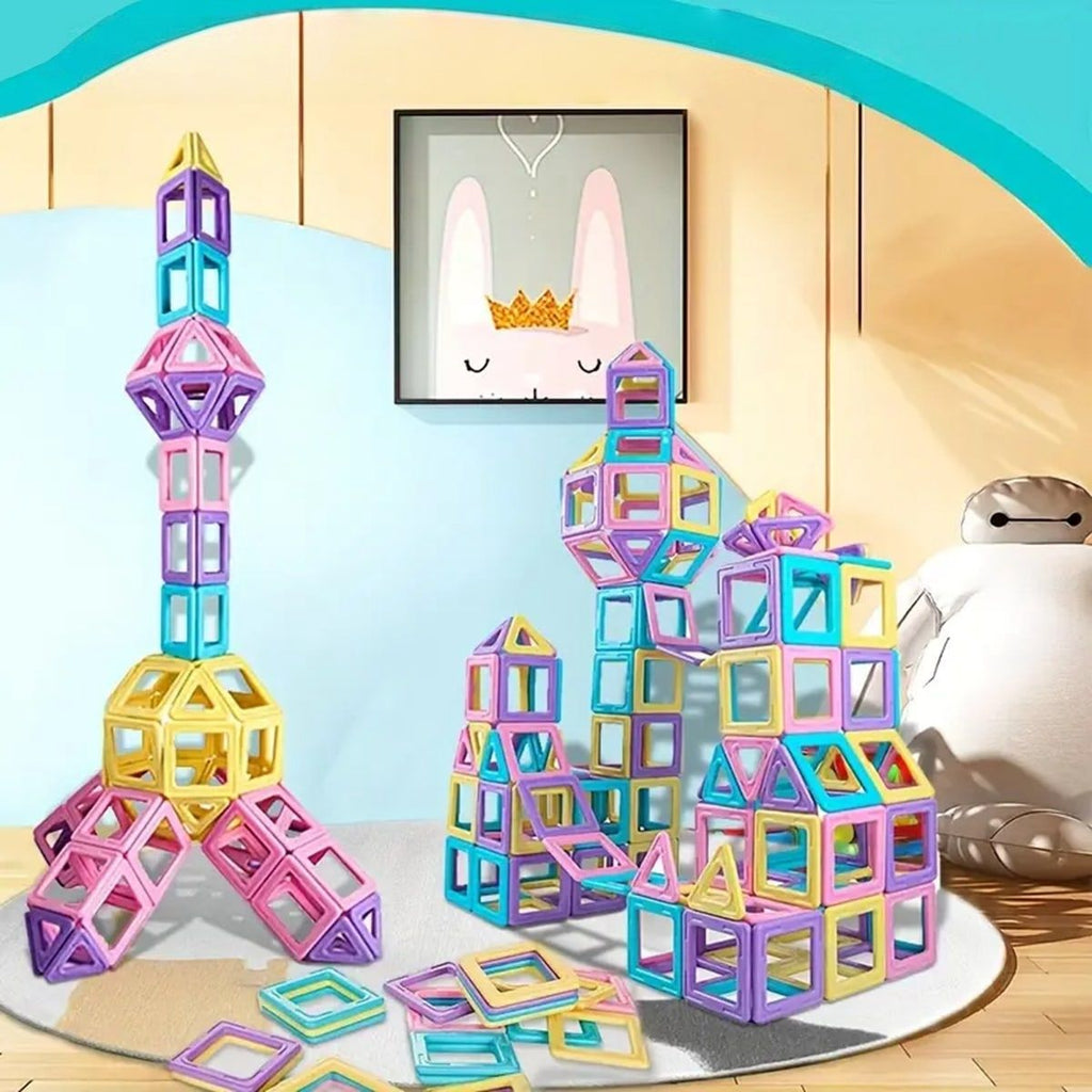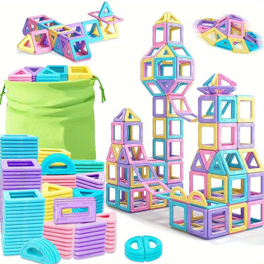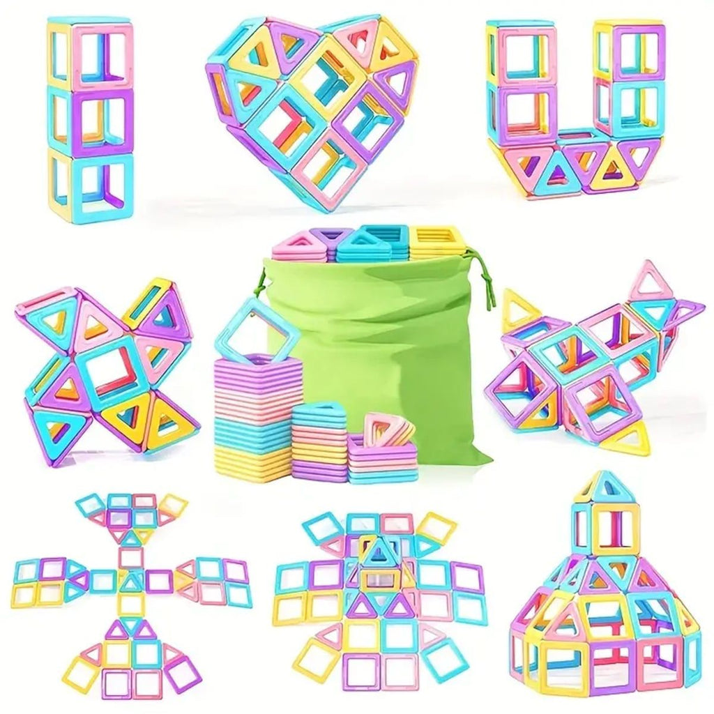 A large set of magnetic blocks that encourages creative building. Includes a storage bag for cleanup.
