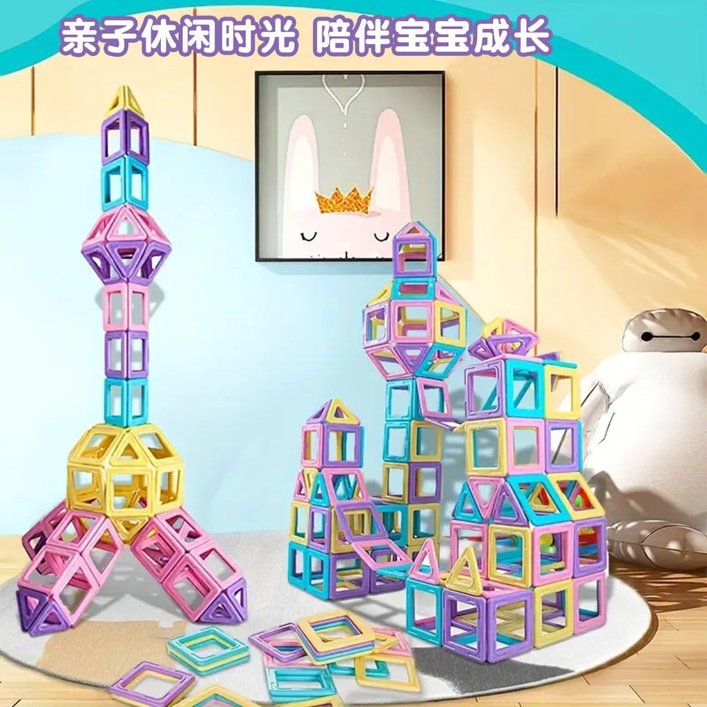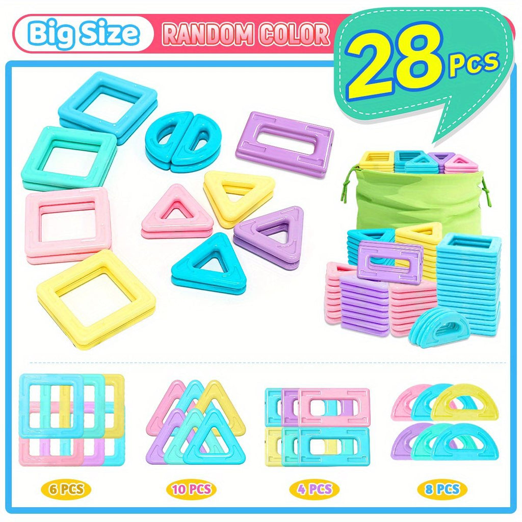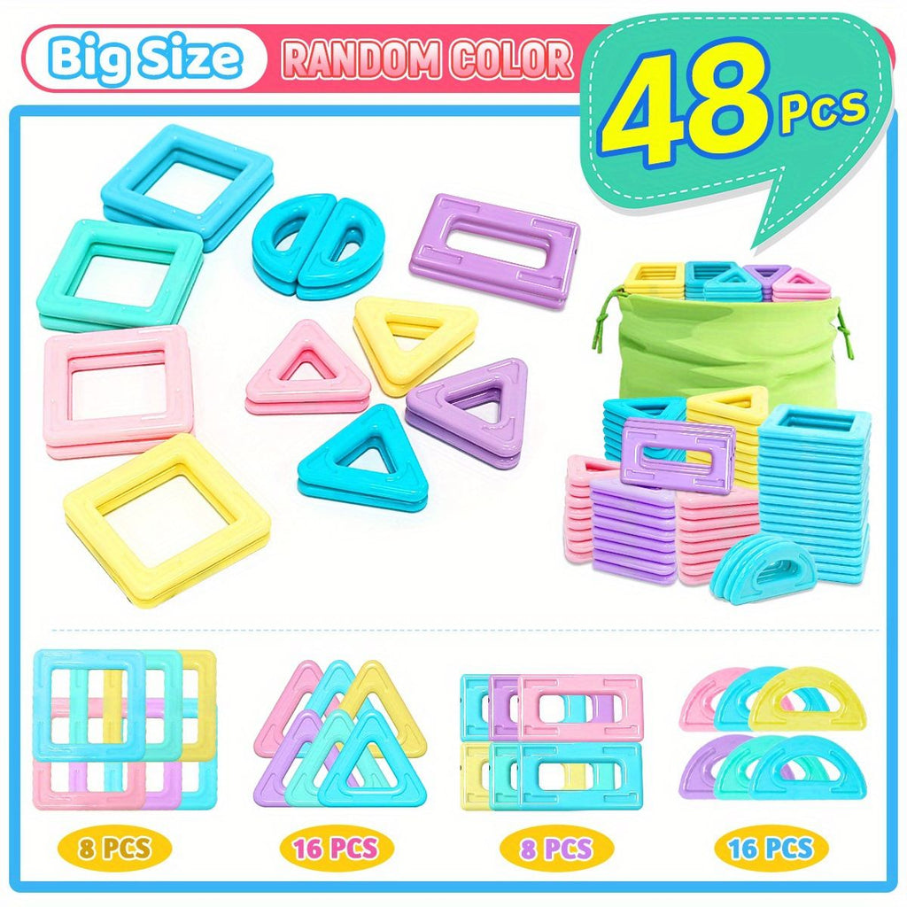 A large set of magnetic blocks that encourages creative building. Includes a storage bag for cleanup.